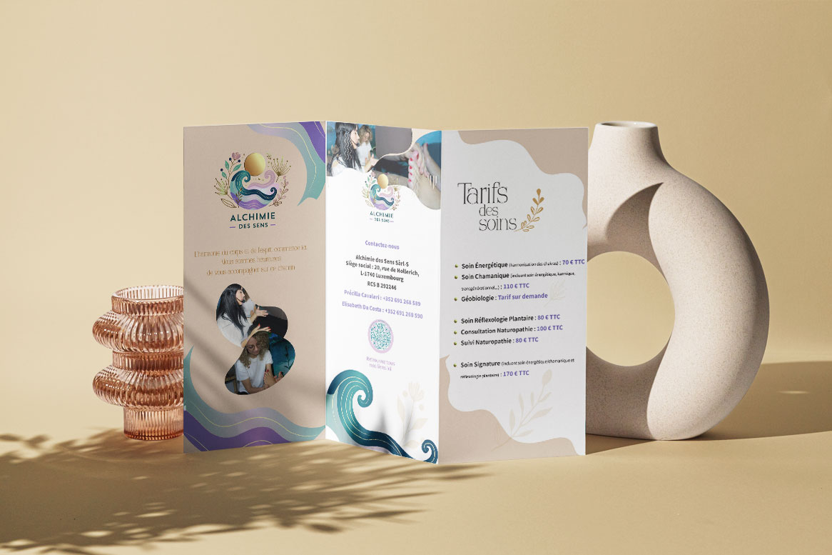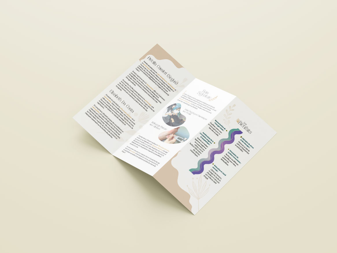 • Brochures et flyers : présentation détaillée des soins et des ateliers, avec une mise en page claire et des visuels apaisants.