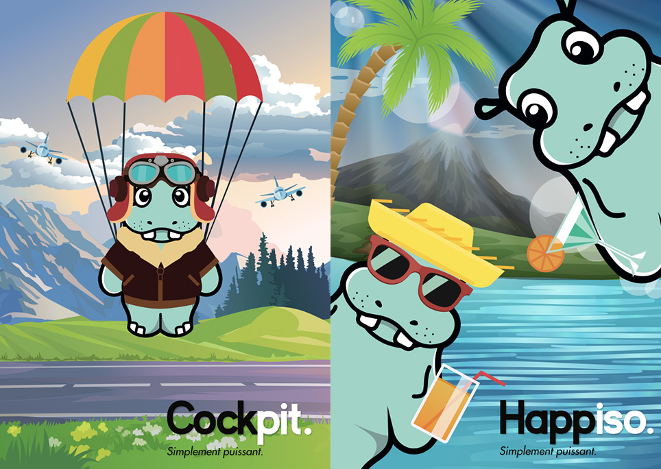 L’univers graphique repose sur une approche à la fois ludique, accessible et différenciante, incarnée par une mascotte attachante : l’hippopotame. Ce choix symbolise à la fois la force tranquille, la solidité des outils numériques, et la simplicité d’usage des solutions proposées.